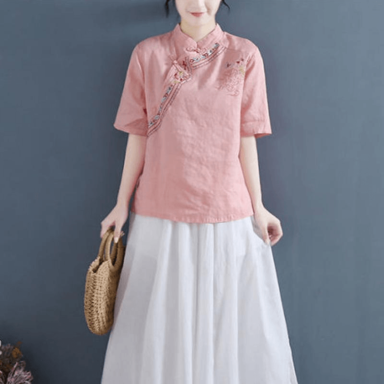 【中国からの直送】ASISスタイル コットン&リネン ボタン刺繍 半袖シャツ トップス - ピンク M