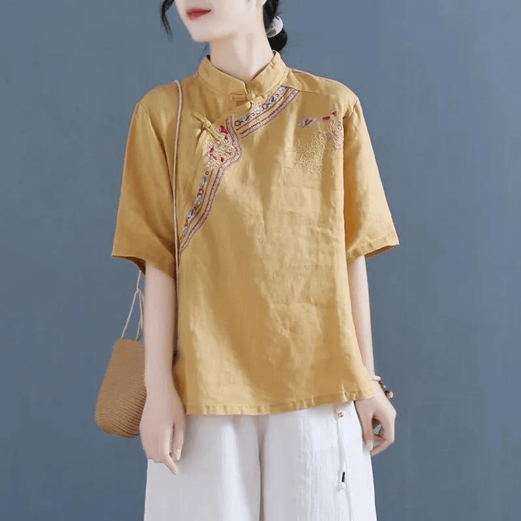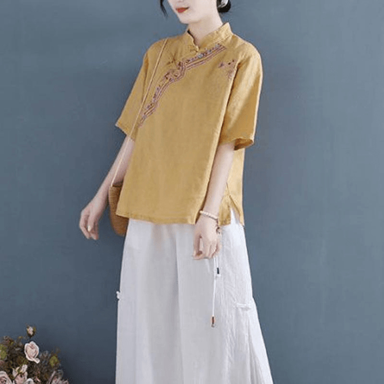 【中国からの直送】ASISスタイル コットン&リネン ボタン刺繍 半袖シャツ トップス - イエロー M