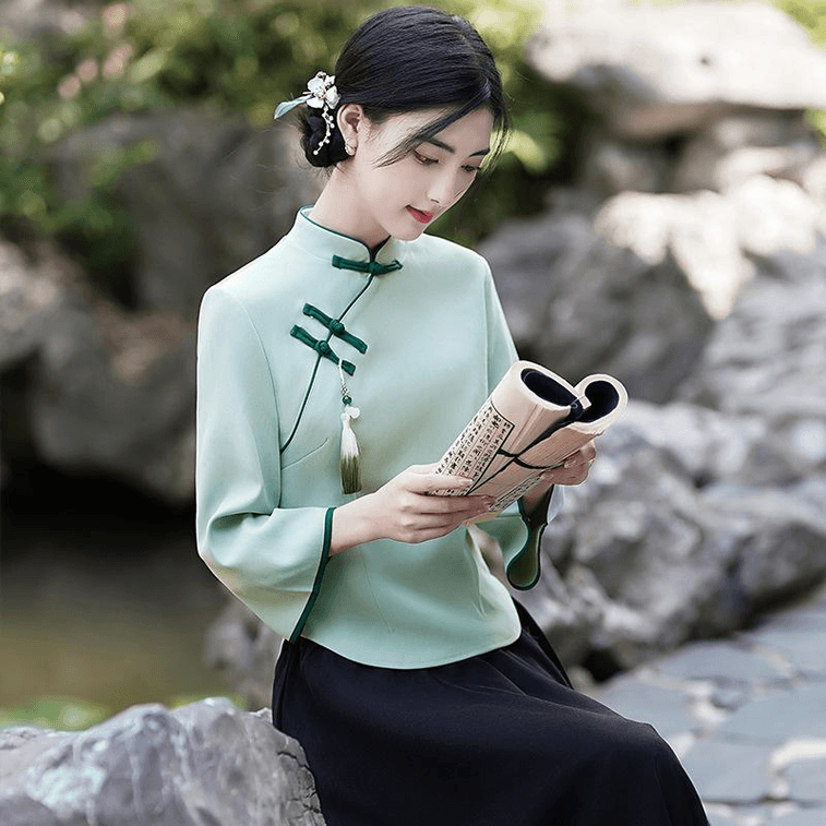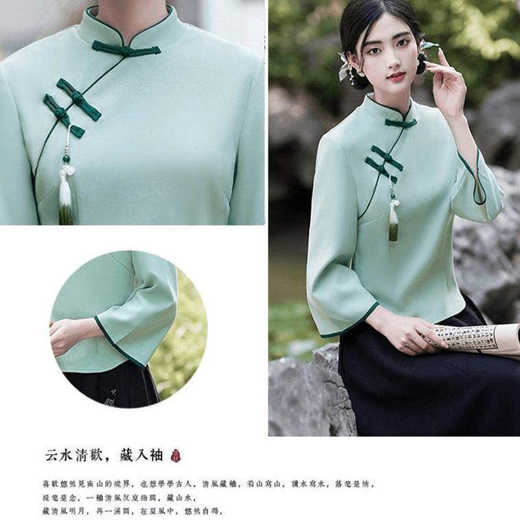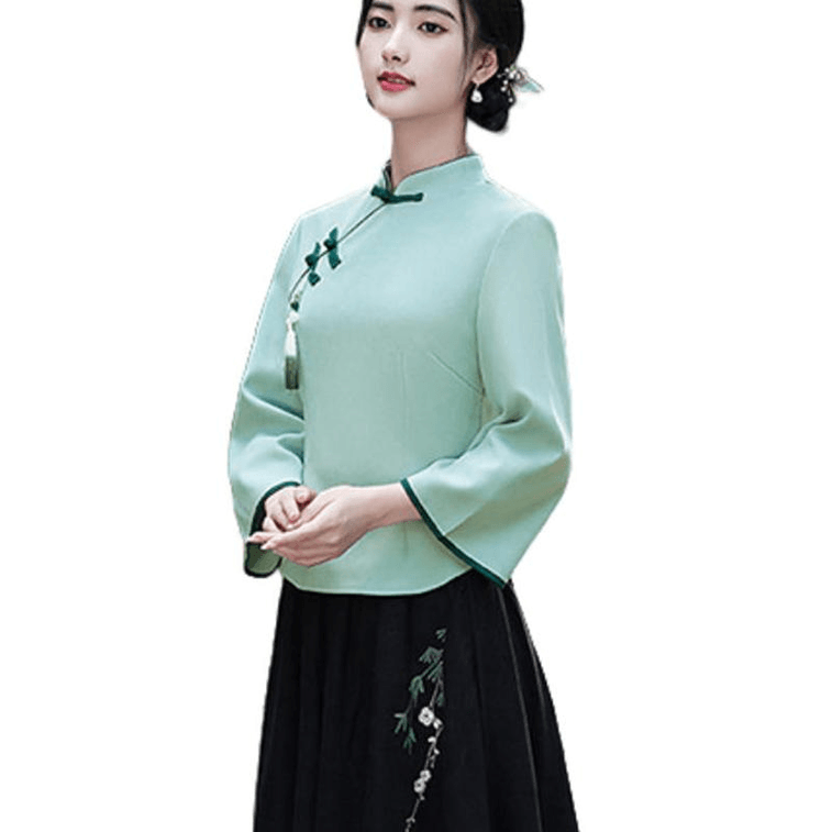 [中国からの直送] ASIS レトロ スラントブレスト ボタン付き チャイナドレス トップス - グリーン M