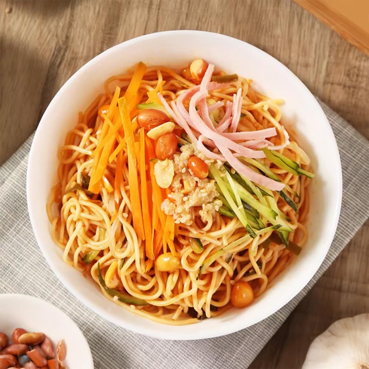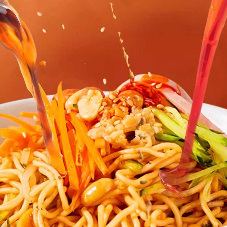 5つの調味料パケットを慎重に組み合わせています。香ばしい赤油、ニンニクペースト、濃厚なゴマソース、ピリッとした冷麺ソース、サクサクのピーナッツ。新鮮でスパイシーでピリッとした味と忘れられない後味を提供します。