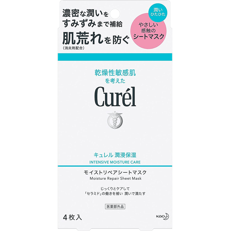 花王(日本)キュレル保湿補修フェイシャルマスク、乾燥肌や敏感肌に最適、1パック4枚入り。