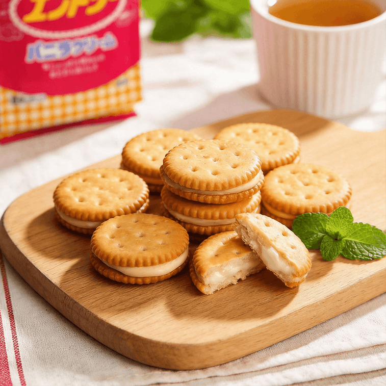 軽くてサクサクのビスケットに、なめらかで甘いバニラクリームを詰めました。