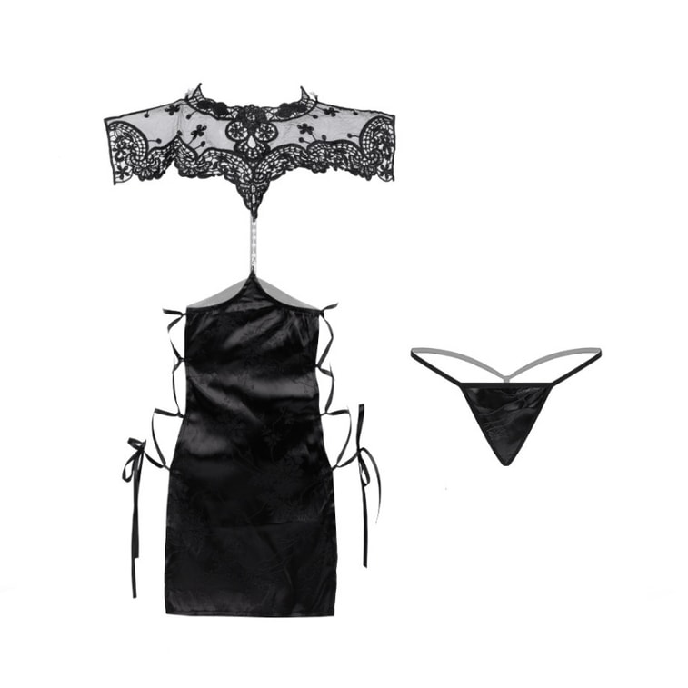 【中国直送】Manyan セクシーランジェリー 中国風 スタンドカラー ボタン付き レースアップ スリット 中空 チャイナドレス ブラック ワンサイズ