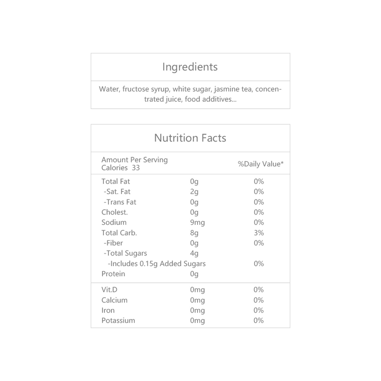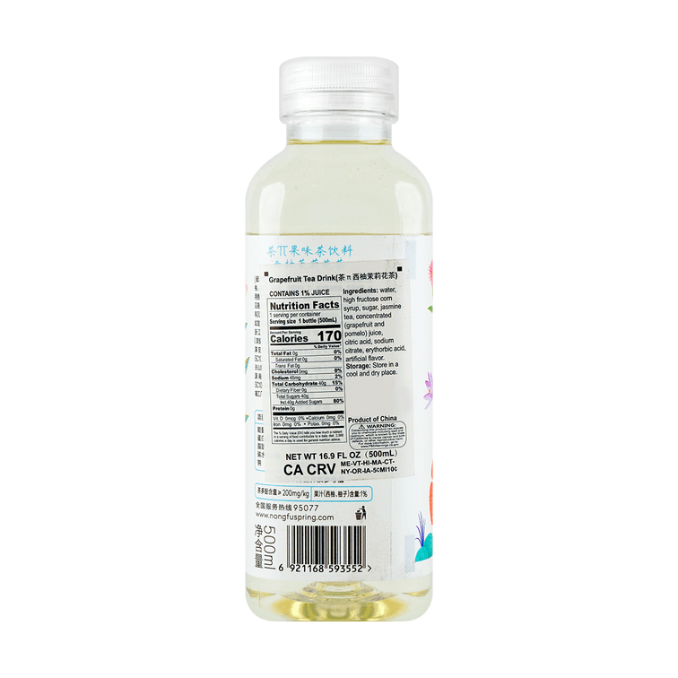 | 材料 | 水、果糖液糖、ジャスミン茶(緑茶片)、濃縮果汁(ウェストグレープフルーツ、グレープフルーツ)、食品添加物など。 |