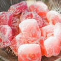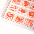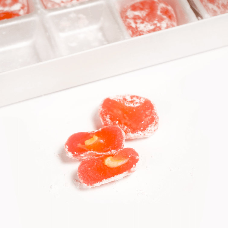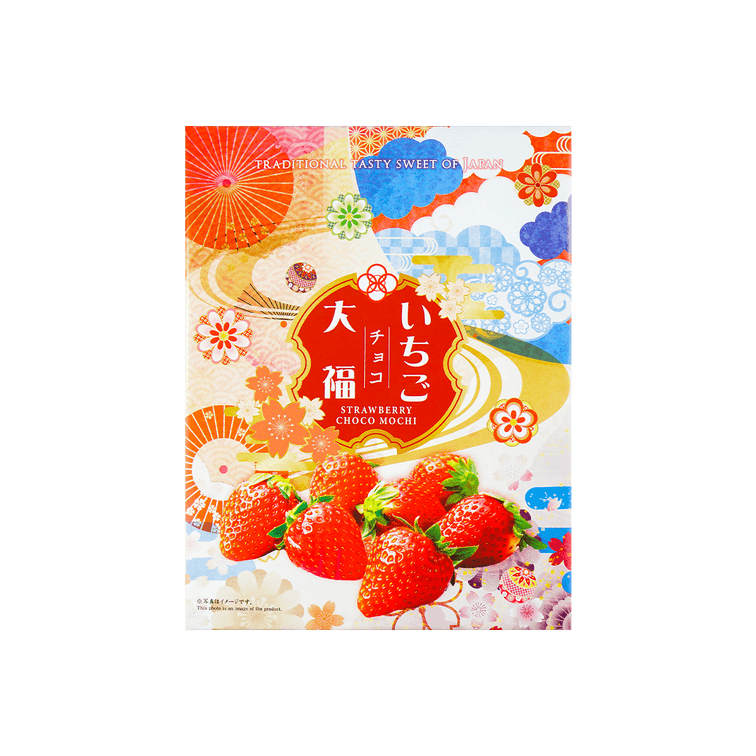 華やかな赤オレンジ色で、フレッシュなイチゴの味と香りが豊かで、フルーティーで軽いイチゴチョコ大福です。素敵な装飾が施されたギフトボックスに入っています。
