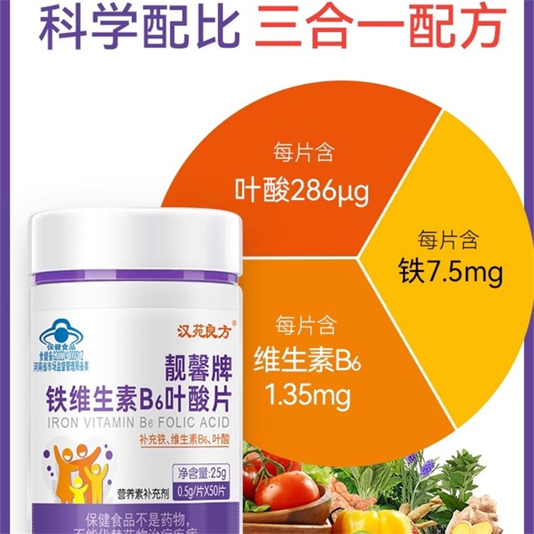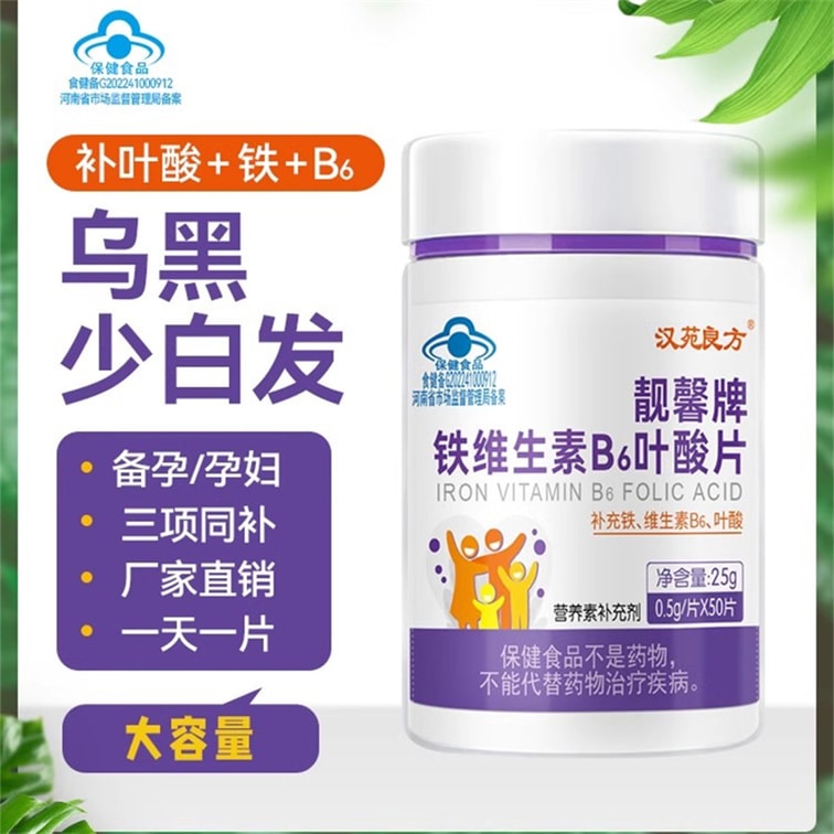 [中国からの直送] 漢源良芳鉄ビタミンB6葉酸タブレット妊婦アクティブタブレット男性と女性白髪黒マルチビタミン50錠/ボトル