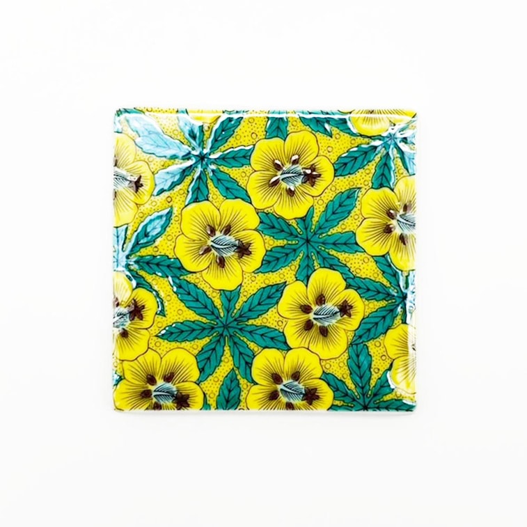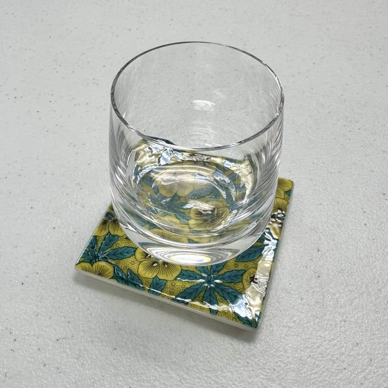 日本の九谷焼手作り正方形コースター (ひまわりの葉模様 3.54 インチ x 3.54 インチ)