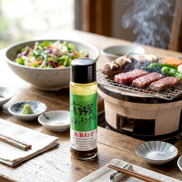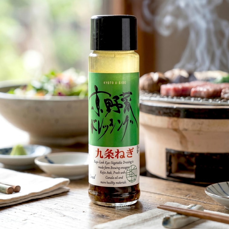 ["このタレは、京都の南山城周辺で栽培される京都を代表する野菜、九条ネギを厳選し、伝統的な製法で丁寧に作られています。冬の京都ならではの自然な新鮮さがタレに溶け込み、ネギの芳醇な香りが広がります。上質な大豆と小麦を原料とした醤油をベースに、りんご酢とみりんをブレンドし、新鮮な九条ネギと刻みネギを加えることで、さっぱりとした上品な味わいに仕上がっています。和風サラダや焼肉、しゃぶしゃぶなどと相性抜群で、その奥深い旨味が食材の甘みを引き立てます。冷製サラダに添えても、つけダレとして使っても、本格的な味わいをお楽しみいただけます。"]["Authentic Kyoto Kujo green onions from Minamiyamashiro, crafted with traditional techniques for a rich and aromatic savory flavor","Premium soy sauce base with apple vinegar and mirin, featuring fresh Kujo and minced onions for a refreshing authentic Japanese taste","Versatile sauce perfect for salads, BBQ, and Shabu-shabu, enhancing natural sweetness as a savory dressing or dipping sauce"]