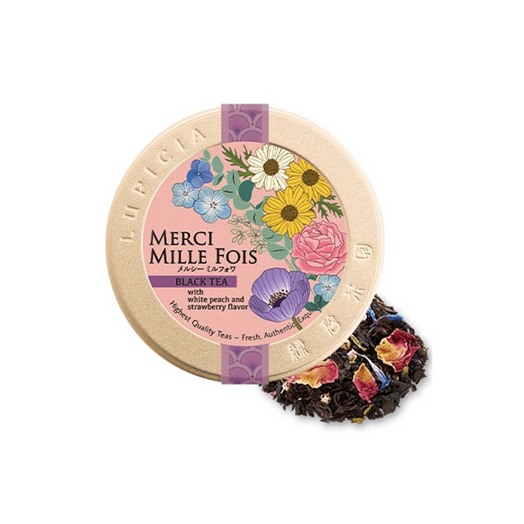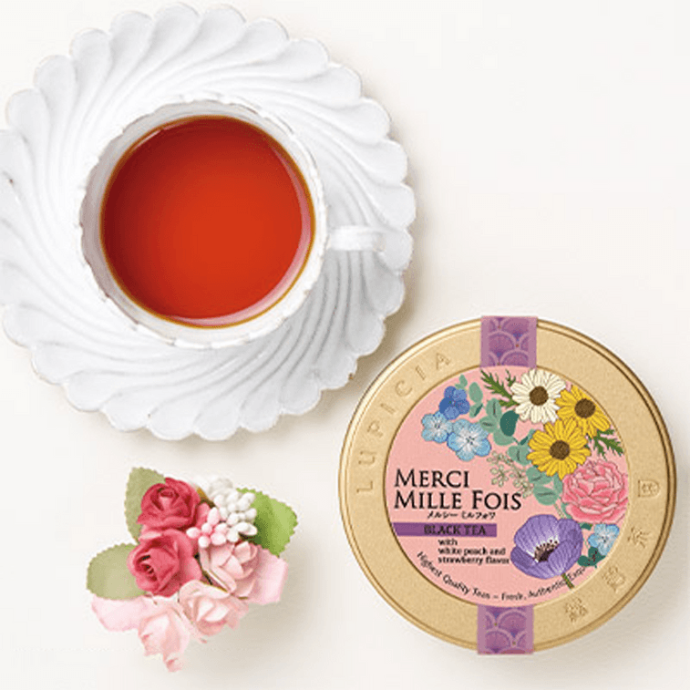 マーシー・ミルフォワ:白桃とイチゴの甘くフルーティーな香りはうっとりするほど。色鮮やかな花びらは美しく、このお茶はフランス語の「ありがとう」を伝える花束からインスピレーションを得ています。