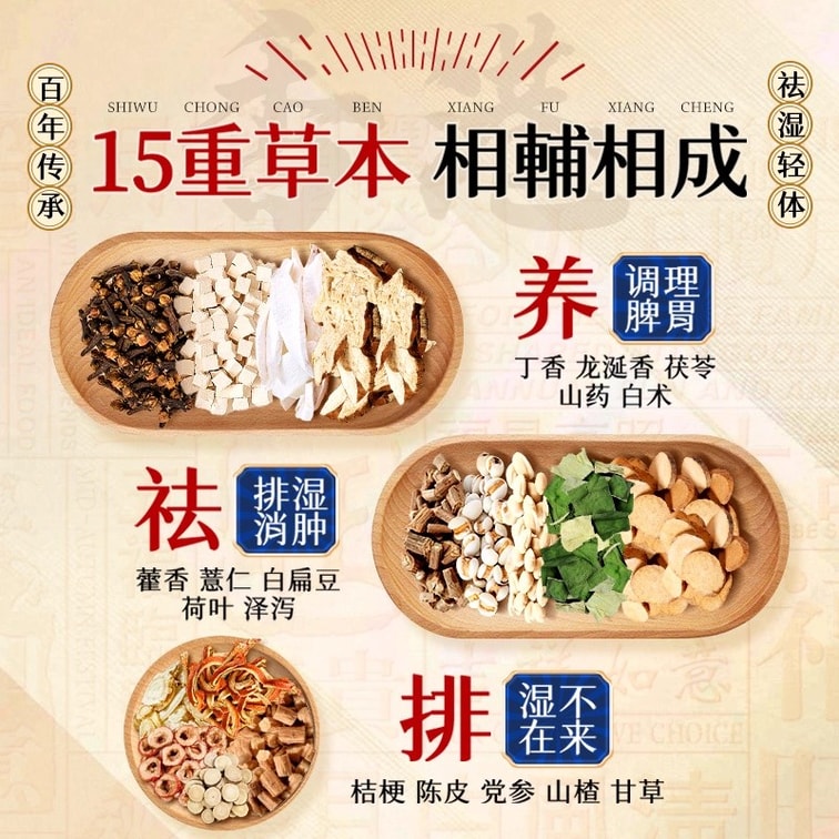 伝統的な原理に基づき開発された天然ハーブパッチ。体内の湿気と冷えを軽減し、体のバランスを整えます。このパッチには、アトラクチロデス、ポリア、ハトムギなどのハーブが配合されており、これらはハーブ療法において、湿気を改善し、血行を促進する作用があることが知られています。