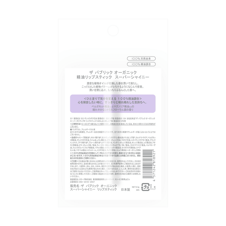 エッセンシャルオイル配合オーガニック保湿リップスティック、3.3g #スーパーシャイニー、シトラスフローラルの香り