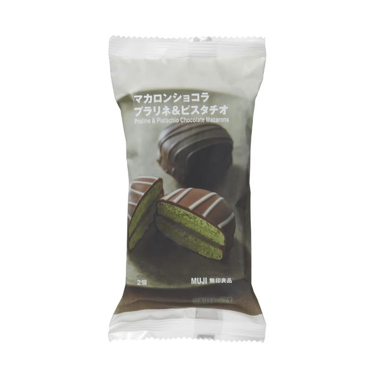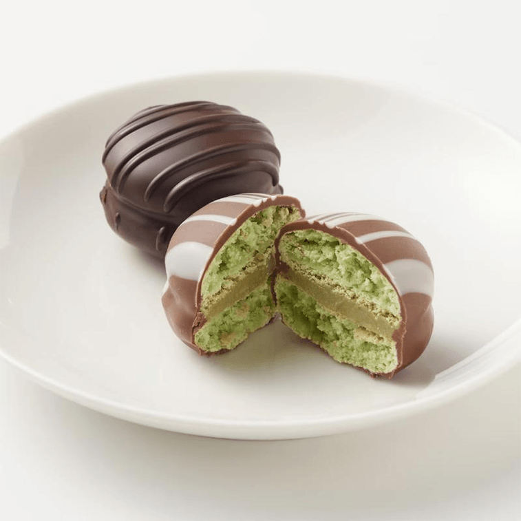 サクサクのチョコレートマカロン。プラリネとピスタチオバターの2種類のフレーバーをご用意しています。