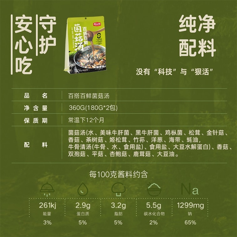 【中国直送】白山子きのこ火鍋スープの素 一人用火鍋小袋 きのこ調味料パック 万能で美味しいきのこスープ 辛くない火鍋の素 360g(2袋入り)