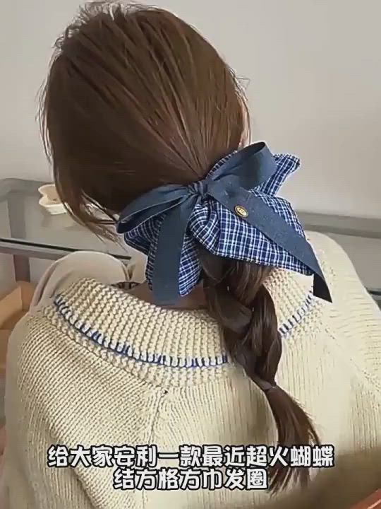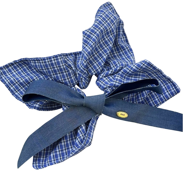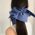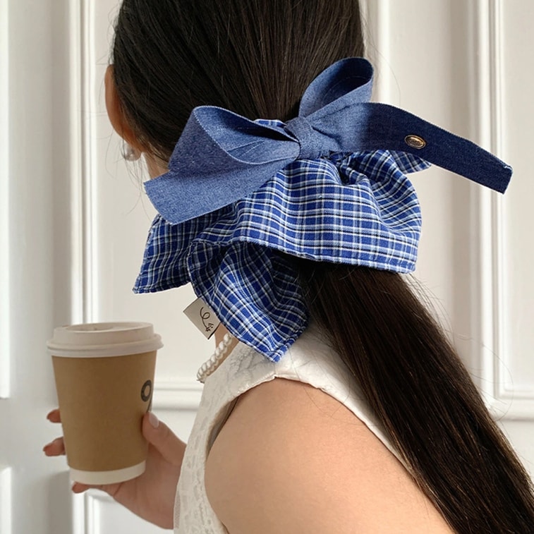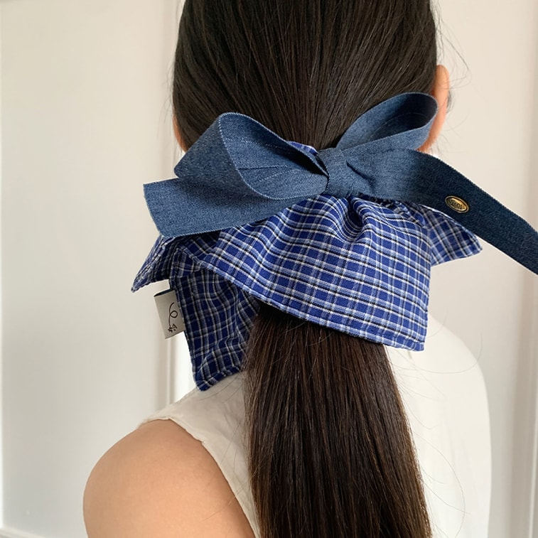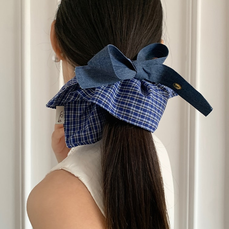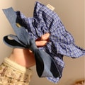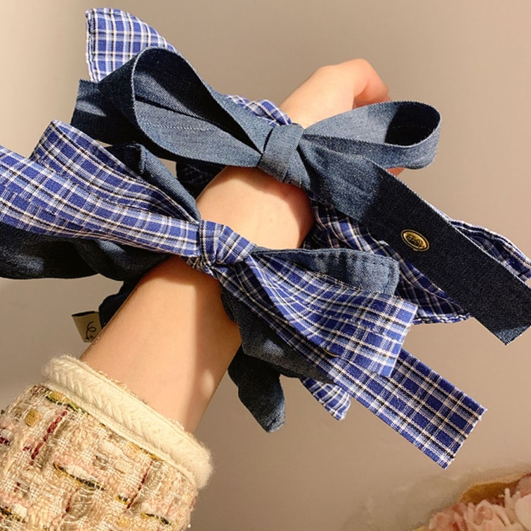 HSPM 新しい韓国の気質デニムボウスクエアスカーフヘッドバンド大腸ヘアバンドレディースハイエンドスクエアヘアアクセサリーヘッドバンドチェック柄ヘアバンドデニムブルーボウF