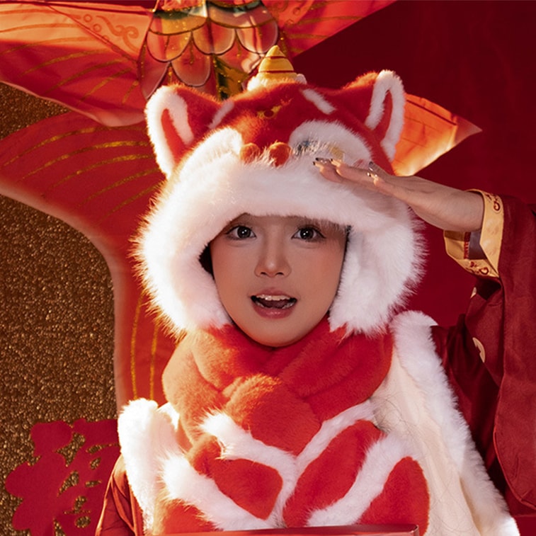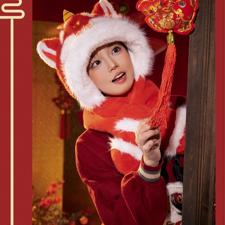 【中国直送】HSPM 新年帽子 レディース かわいい赤い獅子舞帽子 暖かくてふわふわ 動く耳付き 1個 | Yami