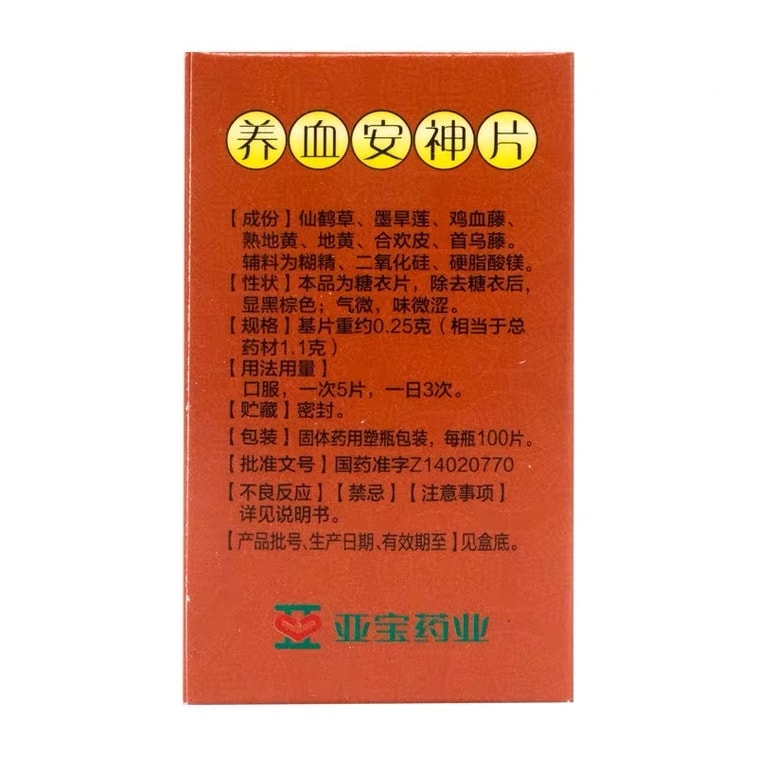【中国直送】雅宝養雪安神錠は、陰気を養い、血を滋養し、心を落ち着かせ、神経を鎮めます。めまい、動悸、不眠、物忘れに。1箱100錠入り