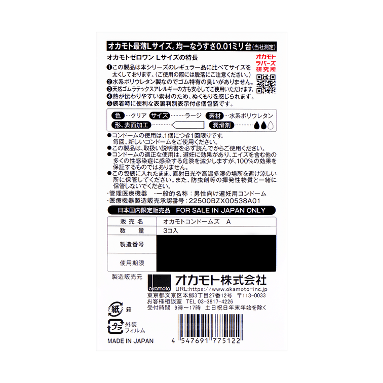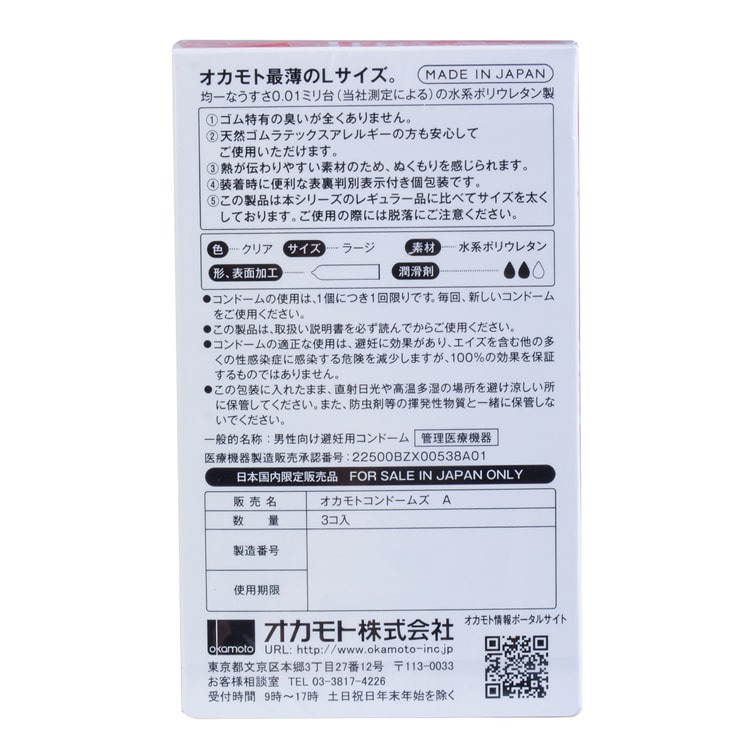 001 超薄型ノンラテックスポリウレタンコンドーム 大きめサイズ 3個入り【日本語版】