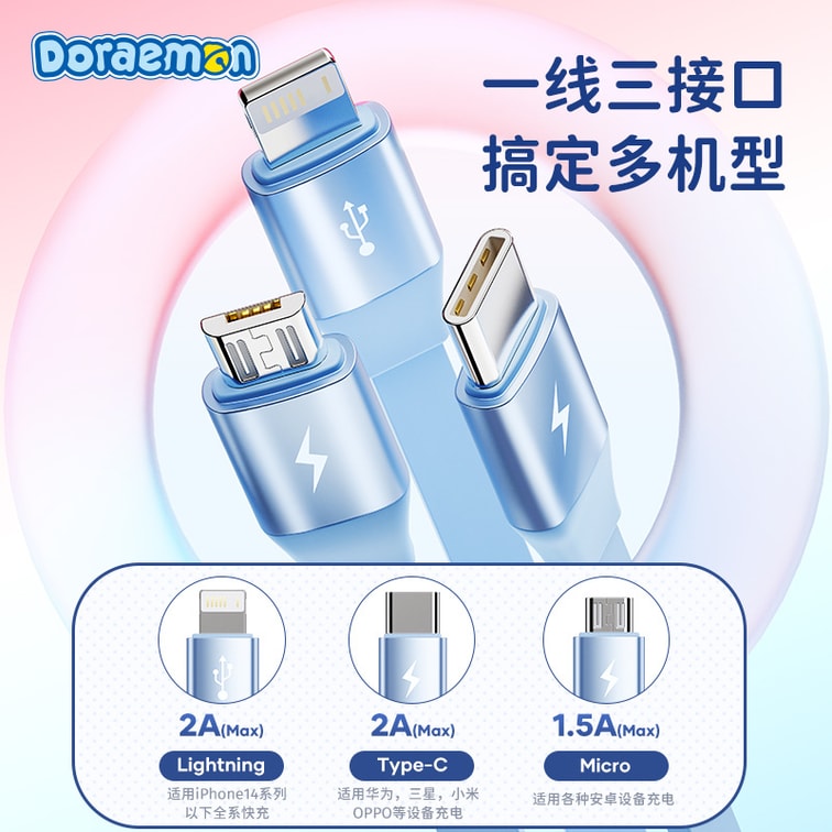 ドラえもん 3-in-1 充電ケーブル (ブルー) 3.5A 巻き取り式データケーブル (1.1m)