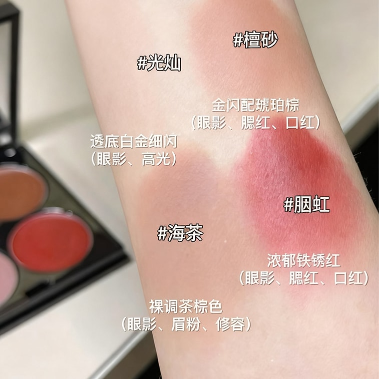 シャドウ、チーク、リップスティックが1つになったパレットです。シルクのように滑らかなテクスチャーは粉っぽさがなく、ブレンドしやすくソフトフォーカス効果を生み出します。軽量で持ち運びやすく、メイク直しにも便利。わずか