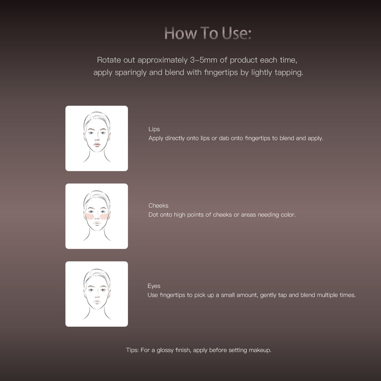 ➌リップ - 唇に直接塗布するか、指先で色を整えてから唇に塗布してください。