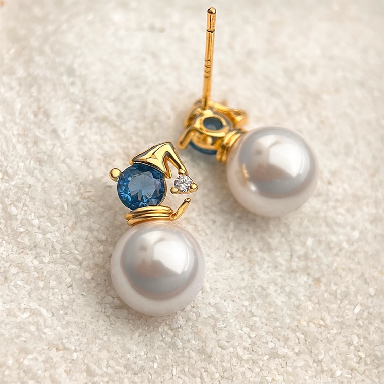 Sea blue zircon snowman pearl stud earrings, gold-plated creative fashion earrings, light luxury sweet style earrings for women