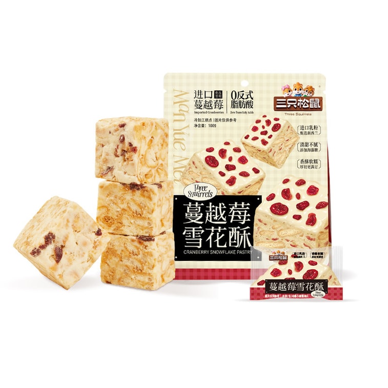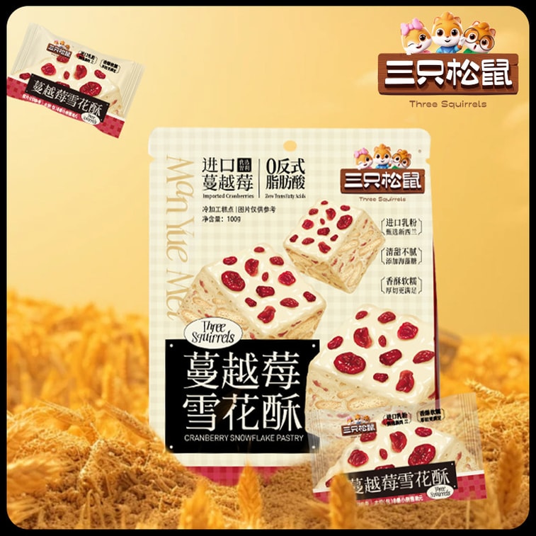 【中国直送】Three Squirrels クランベリースノーフレーククリスプ - 新年の集まりにぴったり!そのまま食べられる、風味豊かなサクサクの伝統的な中華菓子、スナック、特産品。100g×3袋