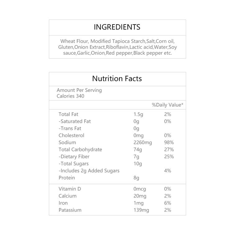 | 材料 | 小麦粉、タピオカ加工澱粉、食塩、コーン油、グルテン、タマネギエキス等 |