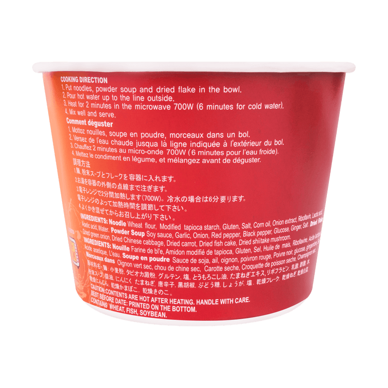 1. 蓋を途中まで開け、ボウルの表示線まで熱湯を注ぎます。 2. 蓋を閉めて3分間蒸らします 3. 蓋を外し、調味料を加え、よく混ぜてお召し上がりください。
