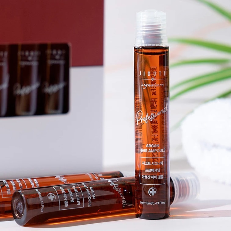 韓国ブランド、ジゴテ モロッコ アルガン オイル ヘアケア アンプル (10 個パック): 軽くて潤いがあり、滑らかで輝く髪に。