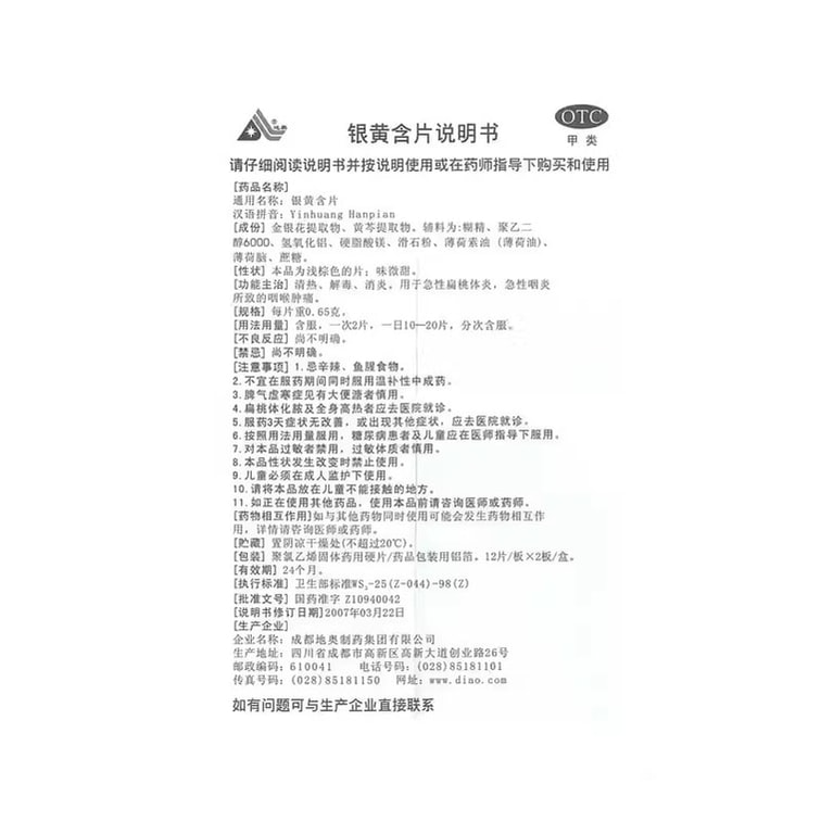 【中国直送】熱を清め、炎症を抑え、咽頭炎を解毒するDi'ao Yinhuangロゼンジ。喉の痛みや喉の痛みに24錠/箱。