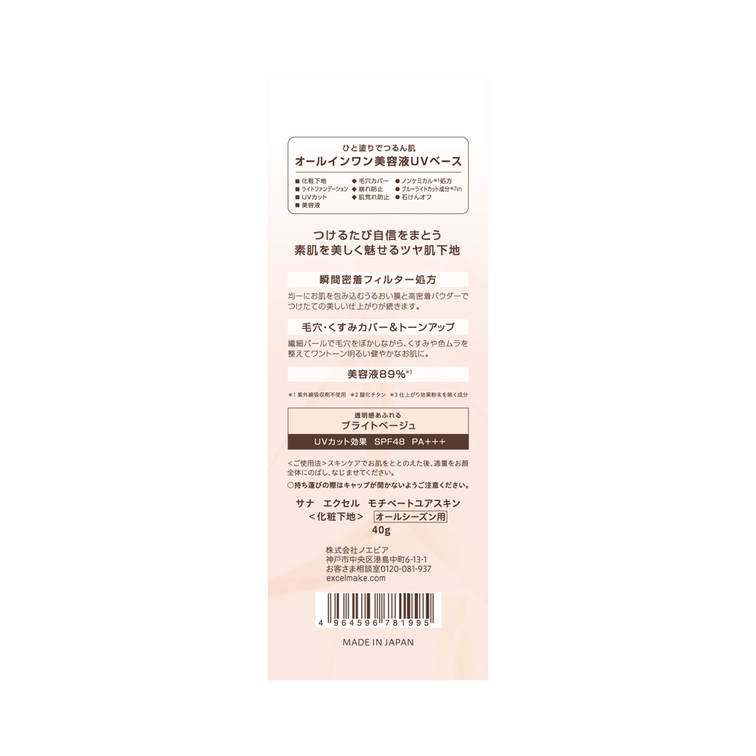 - 商品メリット:ひと塗りでなめらかな肌を叶える新世代美容液日焼け止め下地。