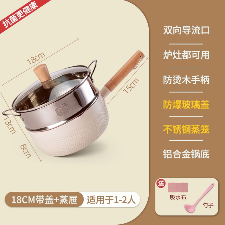 【中国直送】味を楽しむ雪平パン 麦飯石 焦げ付かない小型ミルクパン 18cm 蓋・蒸し器付き ホワイト