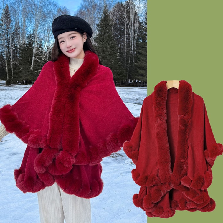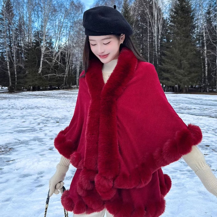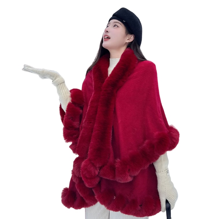 【中国直送】HSPM おしゃれで万能なファーカラーショールコート ダブルケーププラッシュコート バーガンディ F