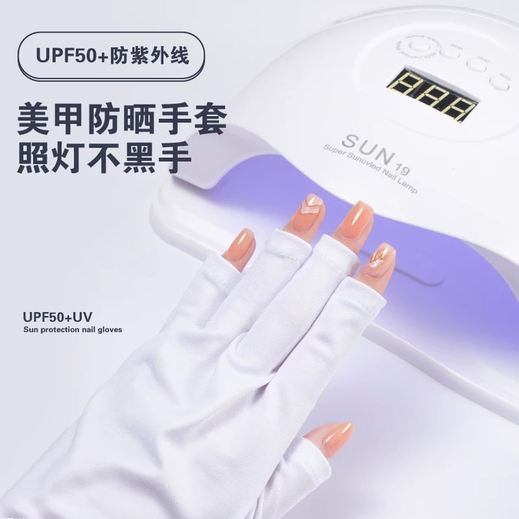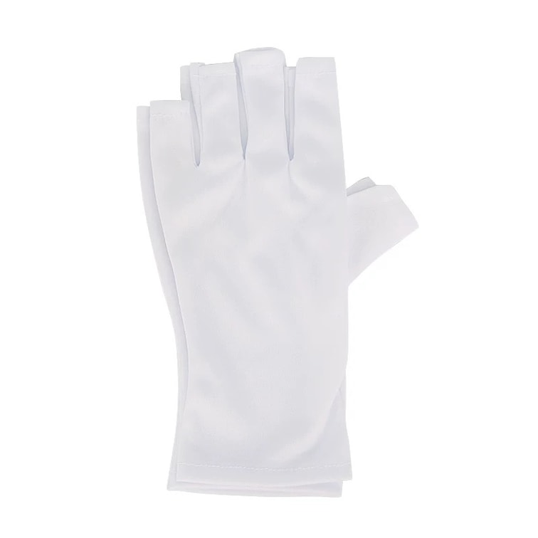 オカマンネイルグローブは、光線療法機による手焼けを防ぎ、放射線と紫外線から手を守る、指が露出する手袋です。白、長さ22.6cm、幅10cm、フリーサイズです。