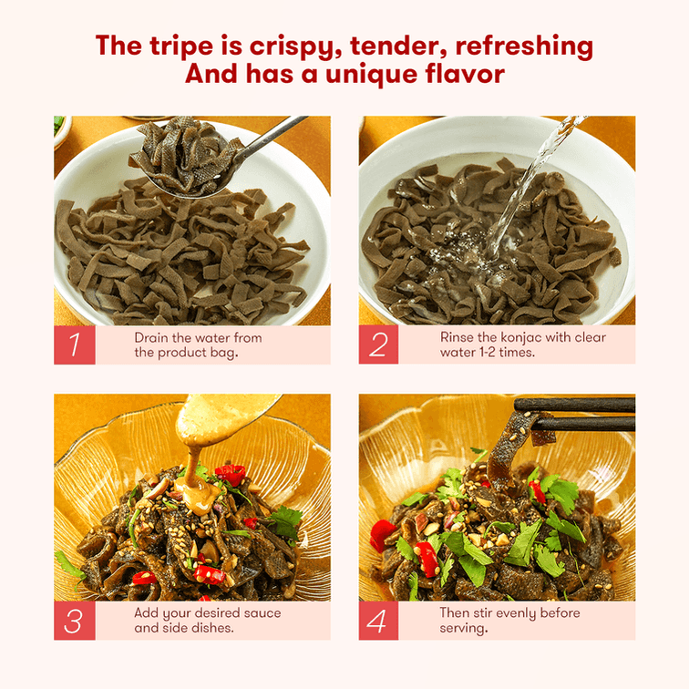 蒟小荘の水揚げ胃袋はこんにゃくで作られており、見た目が毛むくじゃらの胃袋に似ているだけでなく、食感もよく似ていて、サクサクしていて美味しくて弾力があり、胡麻だれの分量も適切に調整されていて、まろやかな味わいで、本格的な味わい、調理も火も使わず簡単操作で袋を開けてかき混ぜてお召し上がりいただけます。