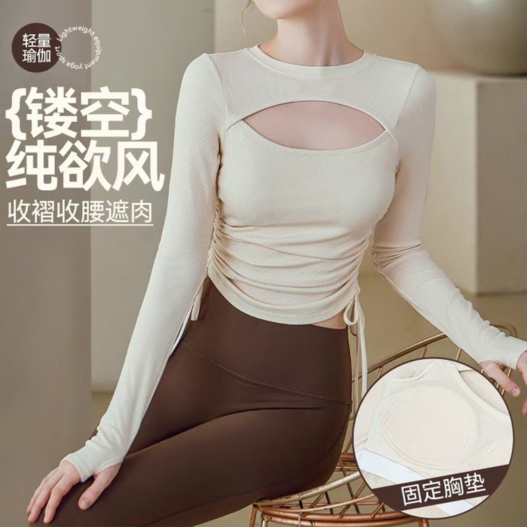 [中国直送] HSPM 秋冬 レディース ヨガウェア ニットベースレイヤー スポーツ アウトドアトップ ドローストリング 長袖 フィットネスウェア オートミールカラー XL