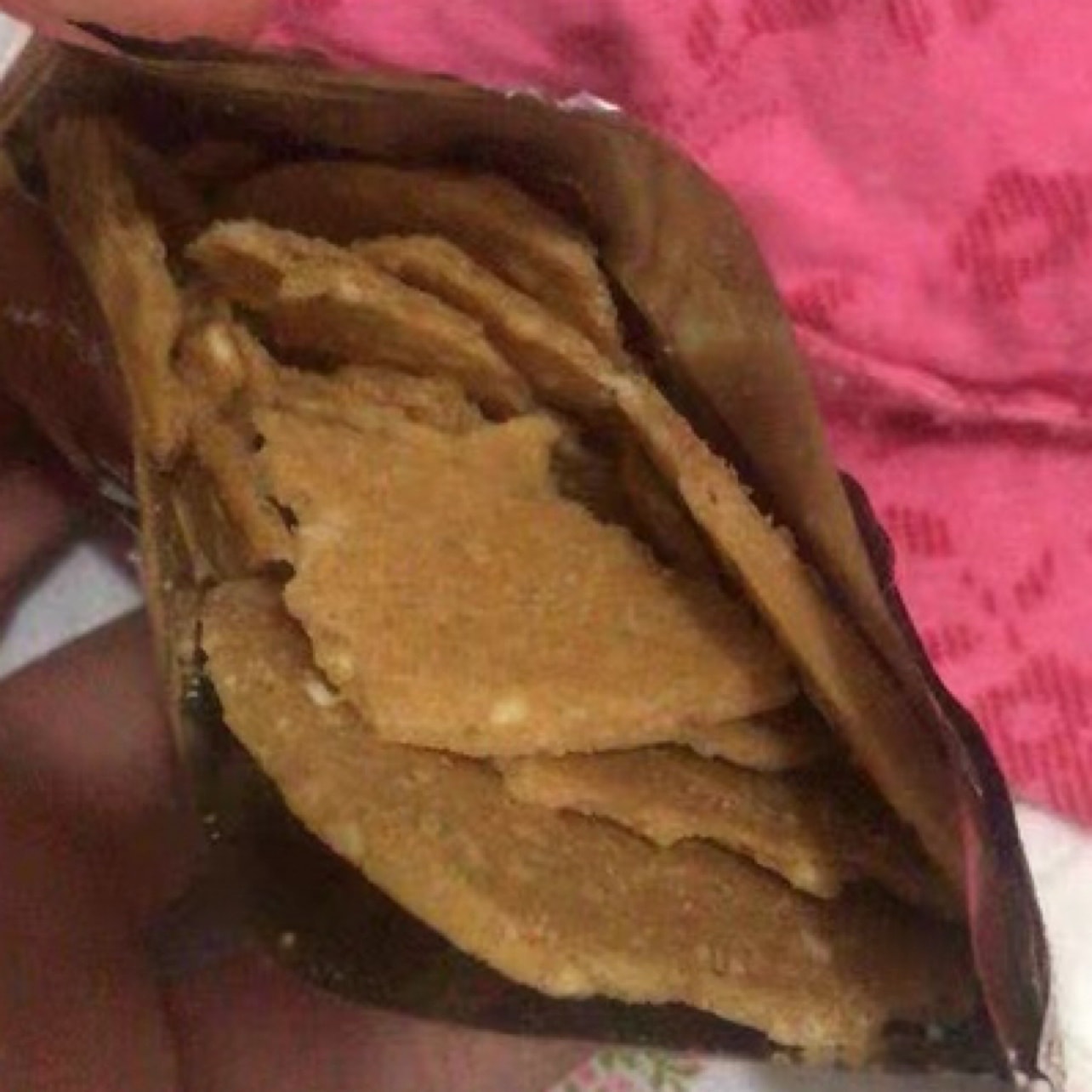第一次尝试这个小零食。发现非常好吃。因为有不少芝麻所以能吃出浓浓的芝麻的香味。一包里面有几片就是容易碎