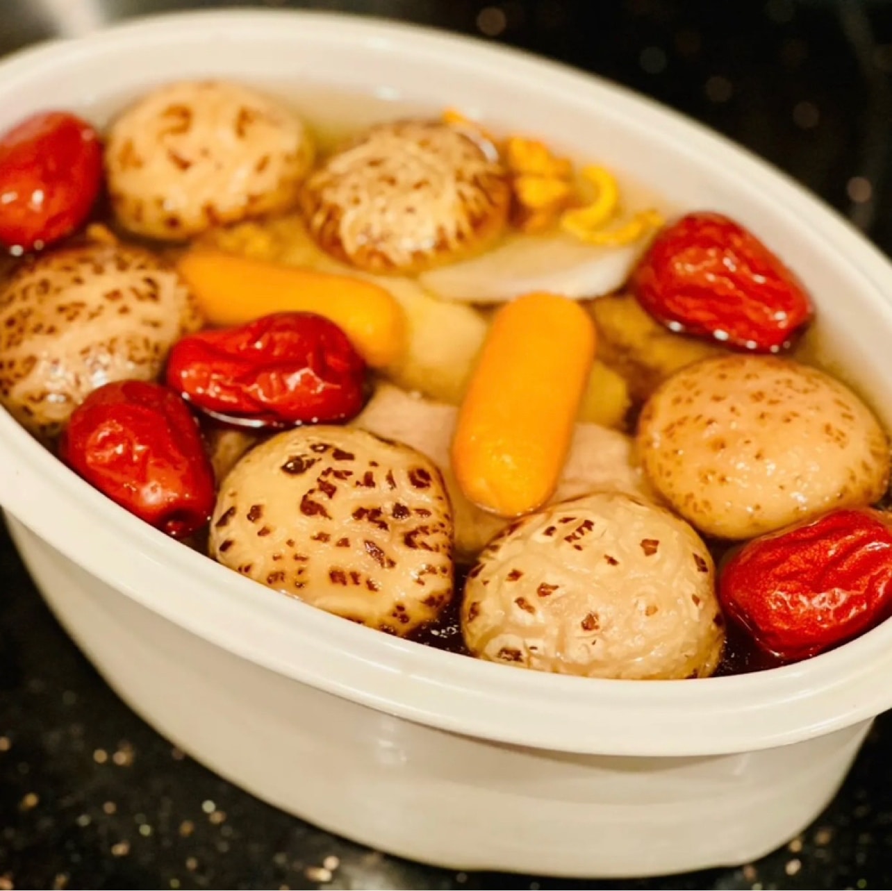 I bought a bag in Yami, Hongye brand Japanese white flower mushroom, 3-4 cm, net content 7 ounces, the production method introduced is: rinse with clean water, soak in clean water, put in the refrigerator for 2-3 hours, use The root is softened, rinsed again, and ready to cook; the soaked white flower mushroom has a beautiful appearance, plump and thick, and has swelled a little. Try to use it in soup, and put red dates, white radish, Cordyceps flower, carrot, and ginger slices. The mushroom tastes soft Tough, tasty and delicious.