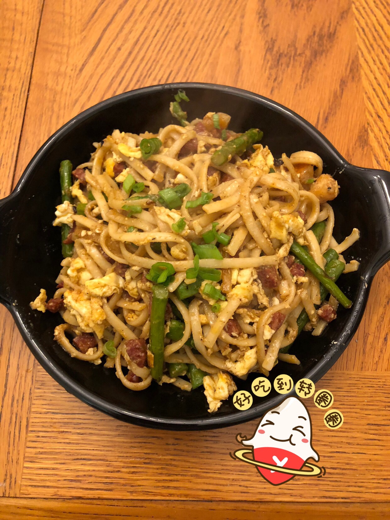 4.Heat the oil, pour the noodles into the pot, add a little salt, MSG and cooking wine (each 1/4 teaspoon) soy sauce (personal preference, add half eachtsponJust do it) , add the eggs and the prepared diced bamboo shoots and sausages, stir fry, add a little sesame oil, Get the pot.