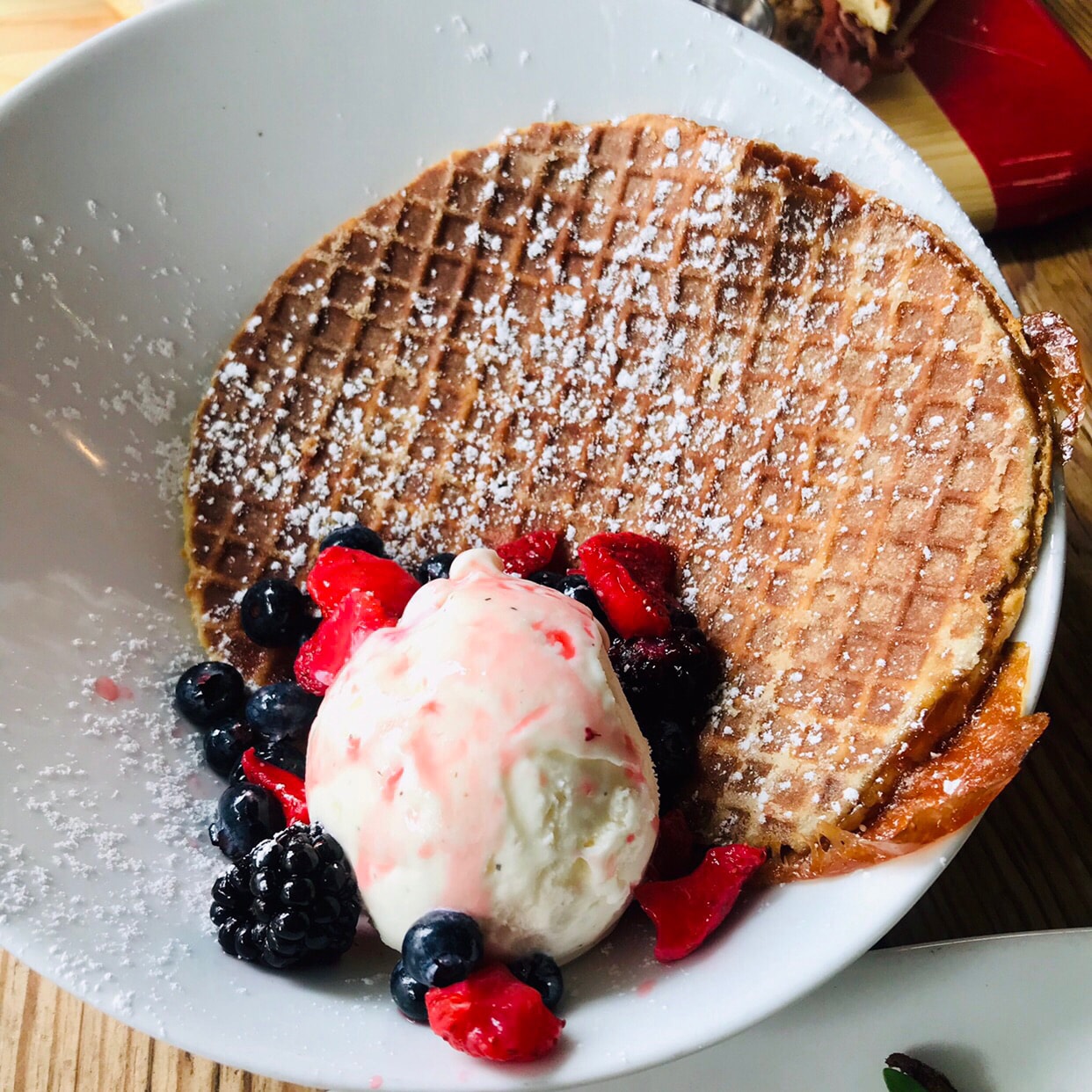 3⃣️华夫饼很薄 烤的脆脆的 两片中间夹着酱 带一点点肉桂味 但是完全可以接受🤗香草冰淇淋真的很好吃了😋