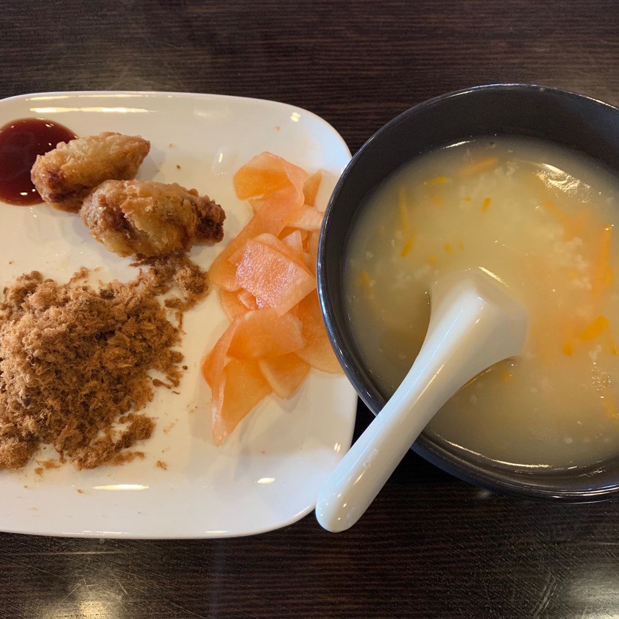 # 我的早餐打卡 #Today is sweet potato porridge with fried oysters, meat floss, kimchi and white radish. 😋