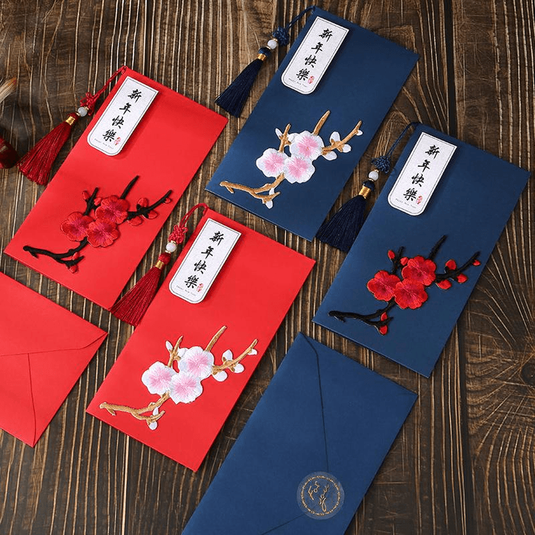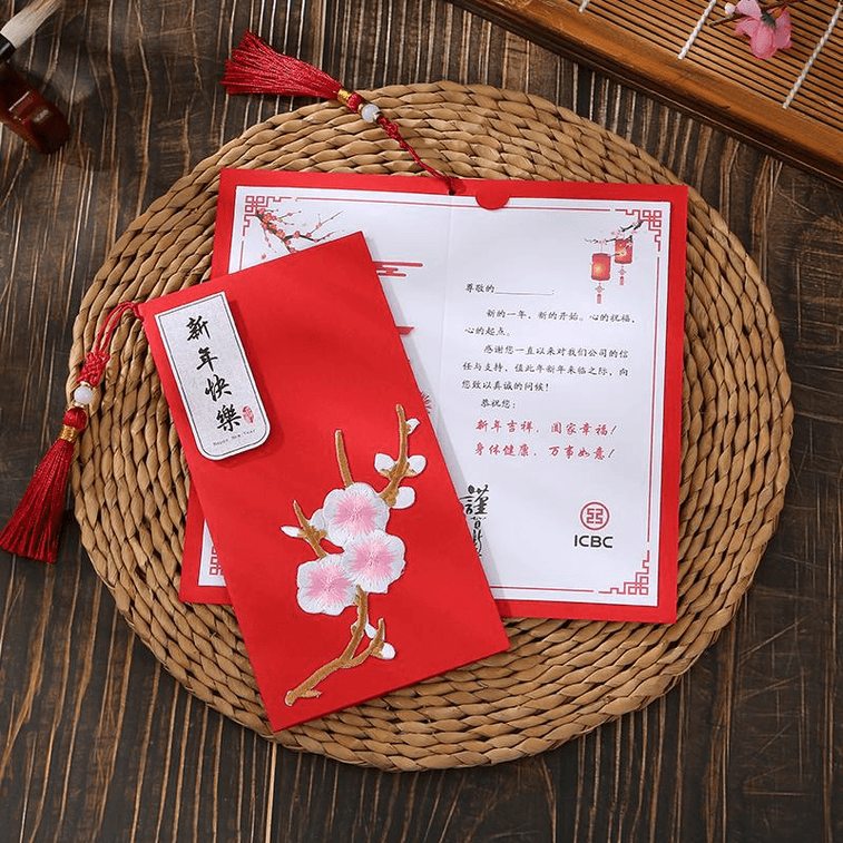 [중국에서 온 다이렉트 메일] 2025년 중국식 신년 축하 카드, 빨간색과 분홍색 자수, 직원 및 고객에게 감사와 새해를 기원하는 고급 비즈니스 선물 작은 카드 * 1장