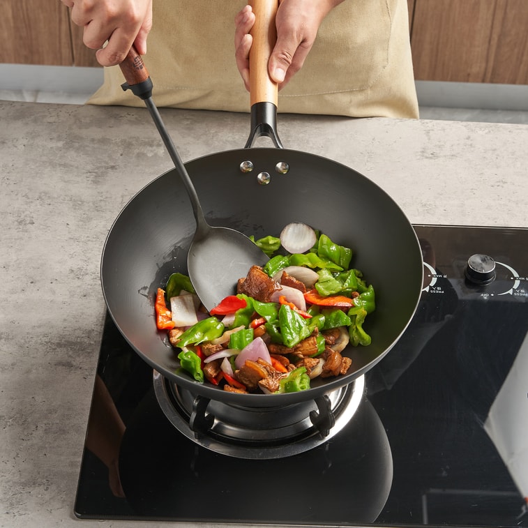 [사용할수록 더욱 부드러워집니다] 다롱 스틸 워크샵 30cm 철근 웍은 볶음 요리에 적합한 강력한 웍/무쇠 팬으로, 중국 요리에 제격이며 코팅 없이도 뛰어난 성능을 발휘합니다. 가스레인지와 인덕션 모두 사용 가능하며 2~4인용으로 적합합니다.