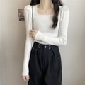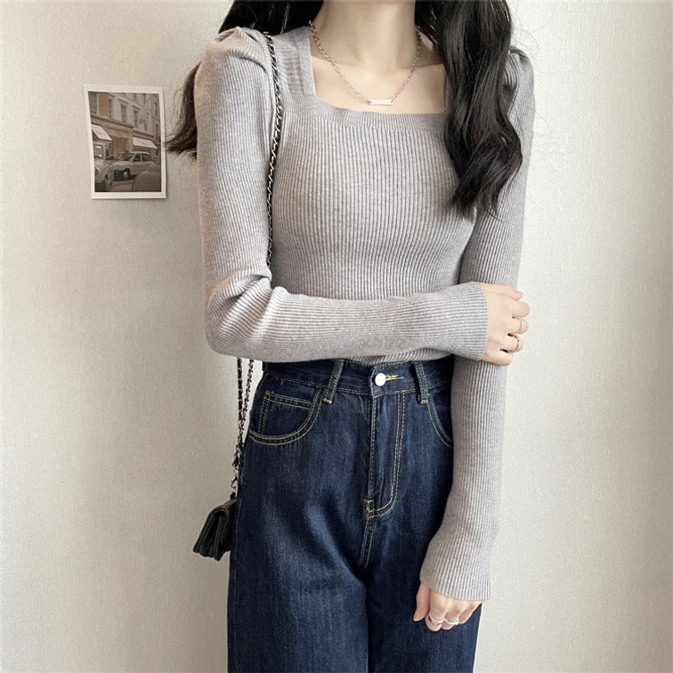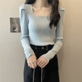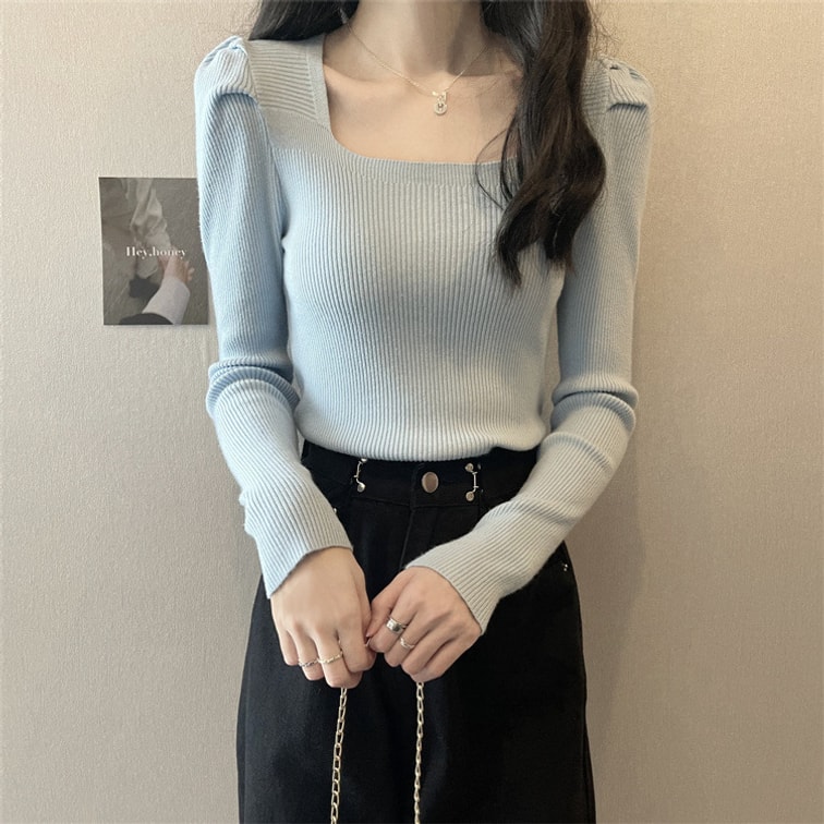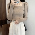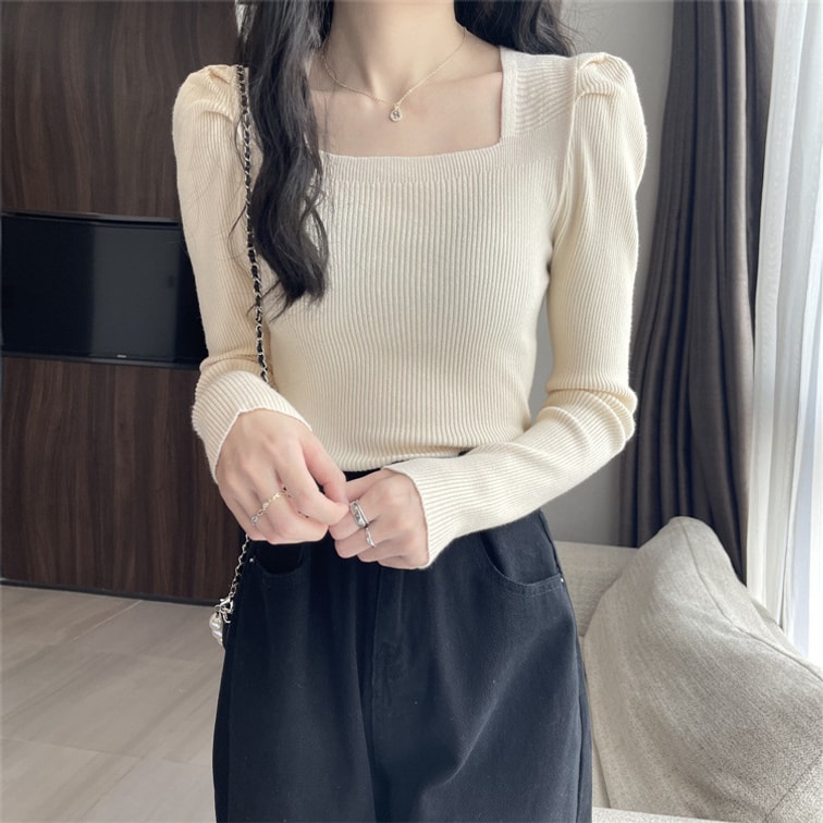 [중국에서 다이렉트 메일] Yinrulan 스퀘어 칼라 가을 겨울 신작 니트 쇄골 로우 칼라 퍼프 슬리브 바닥 셔츠 블랙