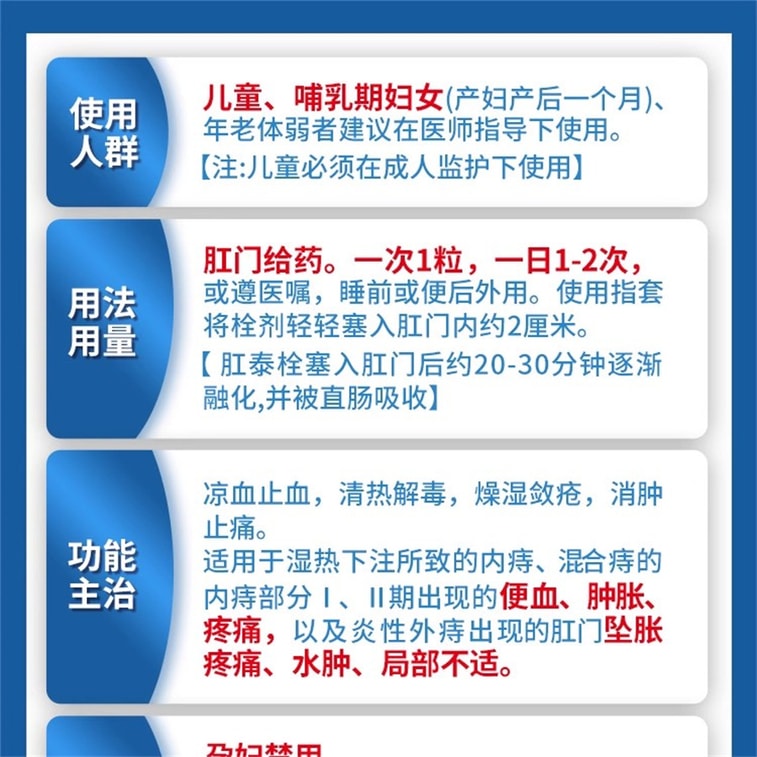 [중국 직송] 룽창 안타이 좌약 (치질, 내치질, 외치질, 혼합치질, 혈변, 항문 부기 및 통증 완화) (1g x 6정/박스)