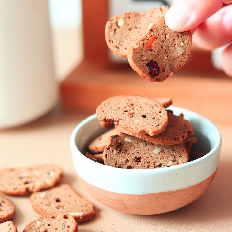 밀가루, 설탕, 해바라기씨, 맥아가루, 아마씨, 오트밀, 기장, 옥수수가루, 옥수수전분, 코코아가루, 메밀알, 식물성 기름, 흰 참깨, 호박씨, 베타카로틴, 버터, 꿀, 말린 크랜베리, 건포도, 말린 블루베리, 오렌지 껍질, 소금, 식품 가공 효모