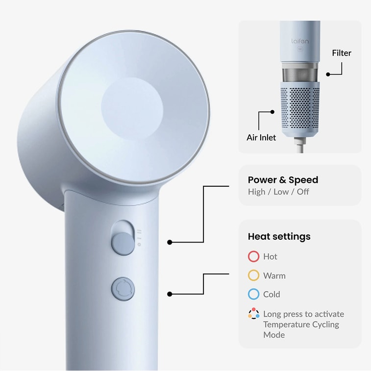 Laifen SE 고속 음이온 헤어 드라이어, 고출력, 빠른 건조, 머리카락에 부드러운, 가정용 헤어 드라이어, 선물 세트 [노즐 2개 포함] [라이트 블루] 휴일 선물로 추천