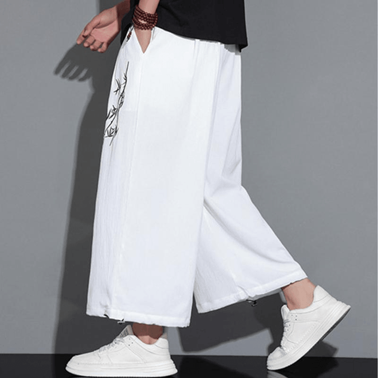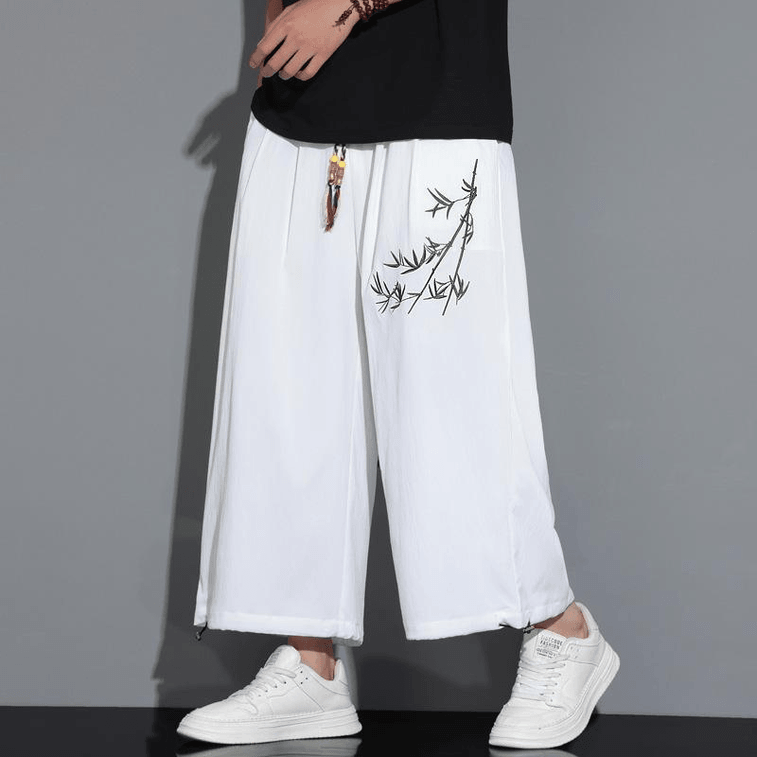 [중국 직송] ASIS 스타일 남성용 대나무 잎 자수 루즈 와이드 레그 하렘 팬츠 - 화이트 2XL