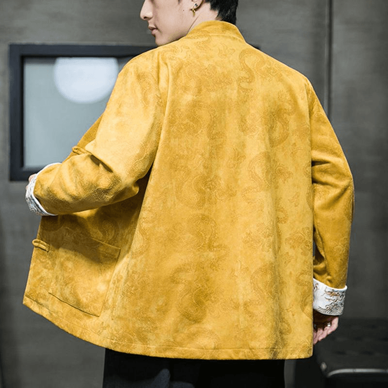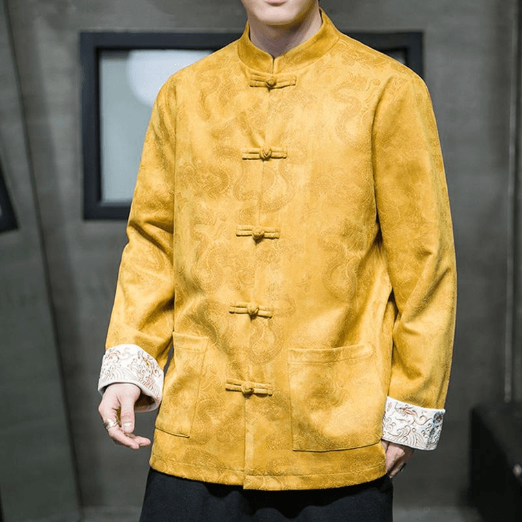 ASIS 중국 스타일 드래곤 패턴 자카드 디스크 버튼 Hanfu 남성 캐주얼 당나라 정장 재킷 - 노란색 L