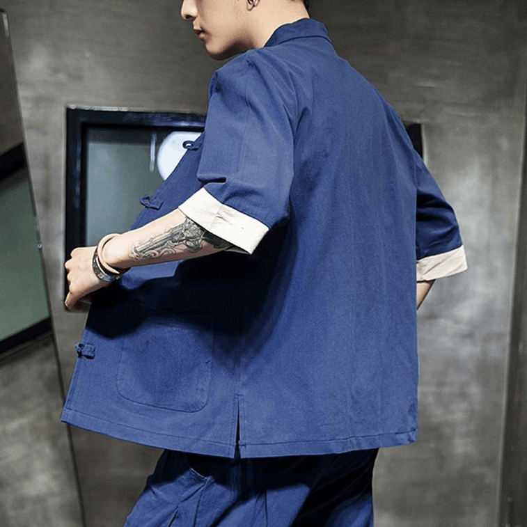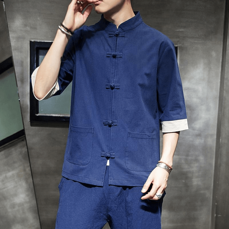 ASIS 중국 스타일 면화 및 린넨 7부 소매 단색 단추 당나라 정장 Hanfu-Navy 4XL